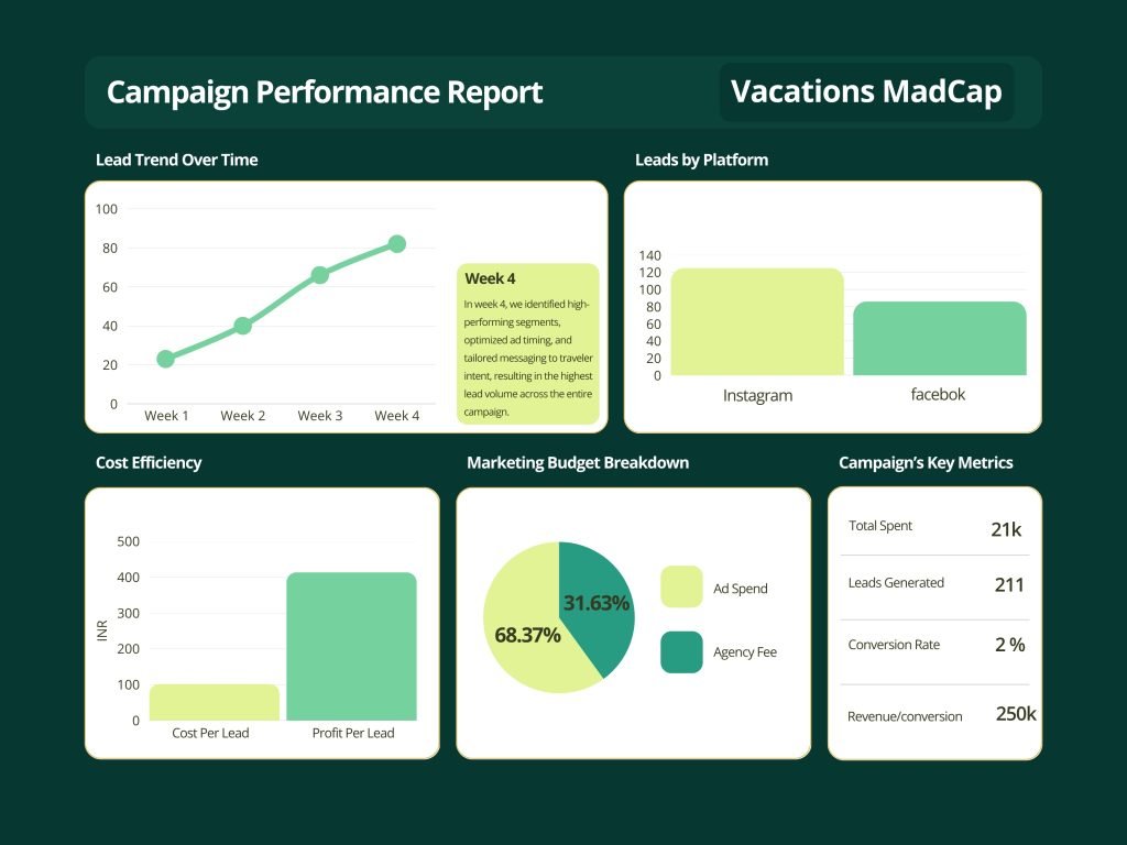 In just 4 weeks, DudeHub crafted a high-intent lead engine for Vacations MadCap. By identifying top-performing segments, optimizing timing, and aligning messaging with traveler intent, we drove 211 leads with ₹250K revenue per conversion—turning a ₹21K budget into a growth blueprint.